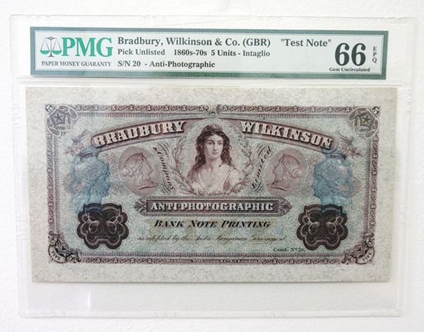 England. BW&C Intaglio Printed Advertising Note, ca.1860-70's, Purple with light blue underprint on silk fiber paper that is light gray, back blank. Extremely attractive and rare advertising note. PMG graded Gem Unc 66 EPQ.
