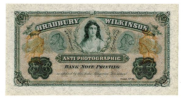 ND, ca.1860's, Multi-color and impressive looking note, Liberty at center flanked by cameos, Detailed and very ornate and one of the more attractive advertising notes seen by the cataloger. Choice AU. Stunning and rare. BWC.