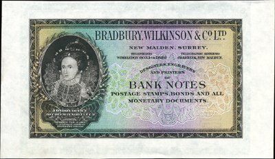 1900-1920. Double sided advertising note with face of note with Queen on left printed in brown and m/c undertint horizontally. Back of note is printed vertically with old fashioned engraver working and "100" denomination. Green border and brown vignette and text. Choice condition. BWC.