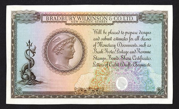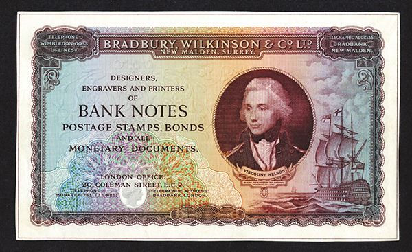 Great Britain. Colorful advertising note. With linear border near trim edge on face. 8x6-7/8 inches. Choice AU.
