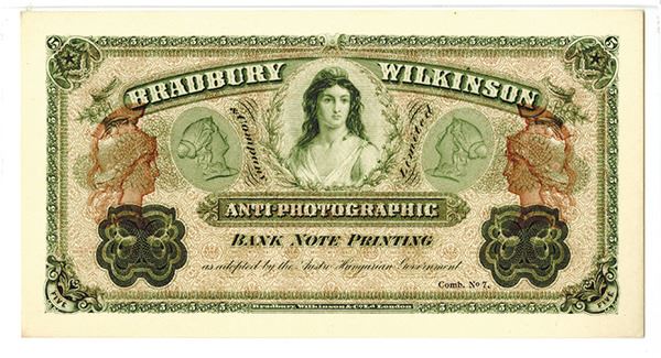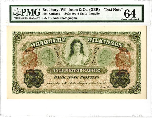 Great Britain, uniface intaglio-printed, "anti-photographic" test note, denomination of "5 Units", five stylized heads facing left, right, and front. BWC. PMG graded Choice Uncirculated 64.