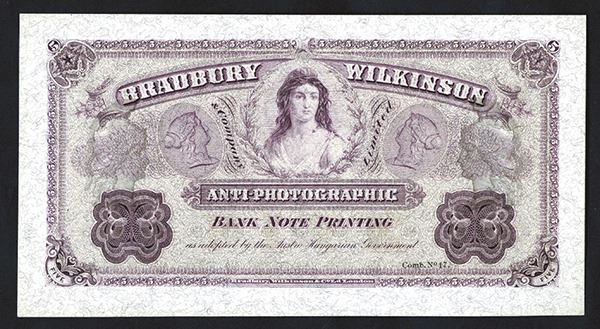England, "5" denomination, Uniface, purple on gray printed on gray paper with multi-color silk fiber. Allegorical young woman in middle flanked by cameo busts on left and right, ornate border and cycloid designs, Uncirculated to CU condition. Rare advertising pieces. BW&C.