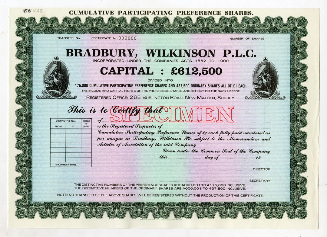 United Kingdom, ND (ca.1960s). Cumulative Participating Preference Shares Specimen Stock Certificate, Black on green border with blue pink and green underprint, Title at top flanked on either side of vignette of man engraving, Specimen overprints, XF-AU condition, BWC.