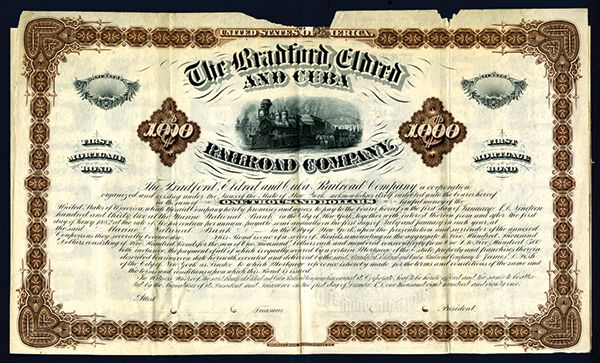 Bradford, Eldred and Cuba Railroad Co., 1881 Specimen1st Mortgage 6% Bond. New York, $1000, Specimen Coupon Bond, Black on brown border and underprint, locomotive at station R-L, horizontal format, VF condition but the top middle margin is missing a triangular 1 inch by 3 inch piece that goes into the border. POC's. ABNC. Unlisted bond variety in Cox. Only 3 were found in the archives.