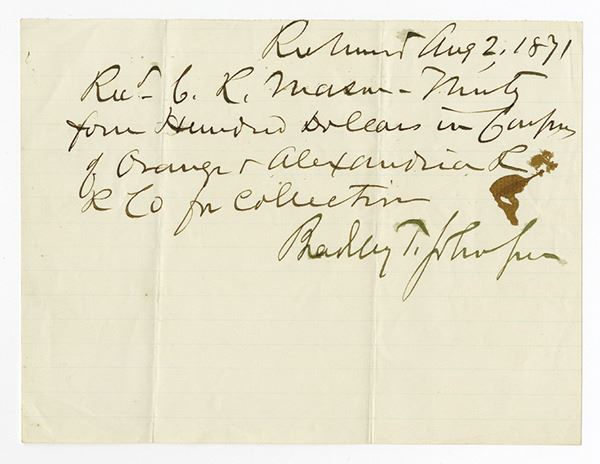 Richmond, Virginia, Autographed financial document for Payment of coupons from Orange & Alexandria RR Co. for $3400 in Coupons. He participated in battles at Front Royal; Winchester; Harrisonburg, 2nd Bull Run; Antietam; Led Maryland Calvary under wade Hampton and many others, in 1864 he became commandant of Prisons at Salisbury, N.C.. Scarce Confederate signature.