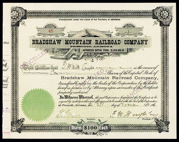 Prescott, Arizona, 1911, 1 Share, Issued, ink and POC stock certificate. Cert. # 45, Black border with light green underprint, Ornate title, no vignette, VF condition.