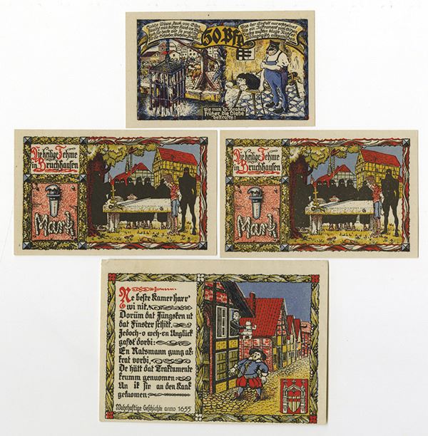 Germany, lot includes from Brakel 50 Pfennig and 2 Mark; from Bruchhausen two 1 Mark notes, different colors, all depicting anti-semetic imagery.