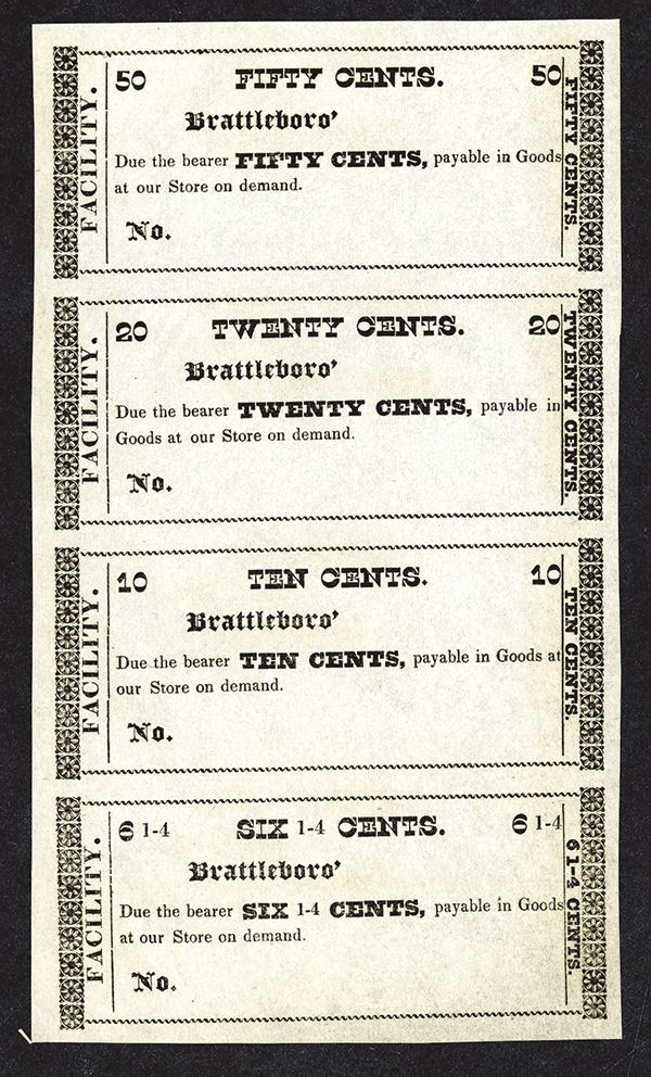 Brattleboro, VT. Uncut Unissued merchant scrip sheet. Brattleboro, VT. ND (ca.1810-30's). 4 different scrip notes on one sheet. Payable in Goods at our Store on demand. Sheet is formatted in vertical row of four. Includes 50cts-20cts-10cts-5cts. Printed on thin brown onion skin like paper. Unc. with mild toning. Rare Vermont Merchant scrip sheet without company name.