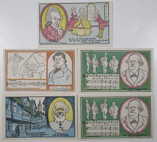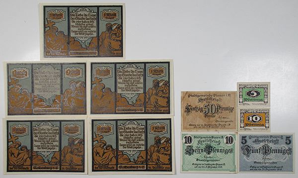 Germany. Lot includes 15 notes from Braunschweich a quintet of 10, 25, 50, and 75 Pfennig Notgeld; from Plauen im Vogtland a small size 5 and 10 Pfennig and a larger trio of 5, 10, and 50 Pfennig from a different series; and from Rothenburg ob der Tauber a quintet of 1 Mark Notgeld, all featuring different buildings and the same s/n 03765. About to Choice Unc. (15)