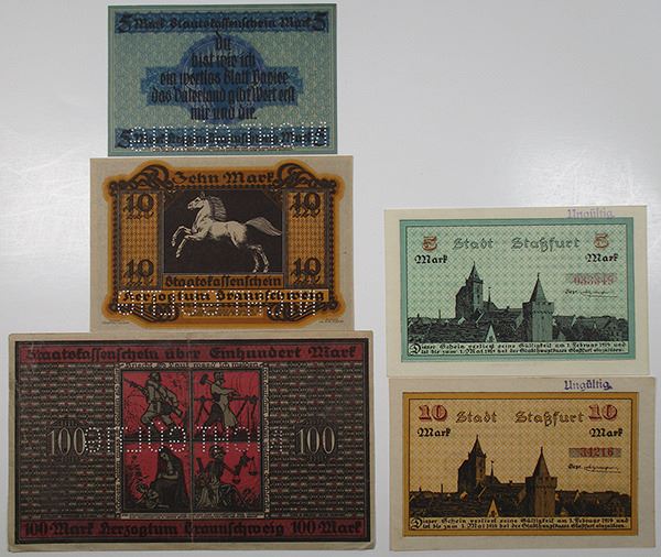 Germany. Lot of 5 notes, includes notes from Braunschweig a trio of 5, 10, and 100 Mark, perforated NICHT G LTIG ("not valid" in German); and from Sta¤furt a pair of 5 and 10 Mark Notgeld. XF to Unc. (5)
