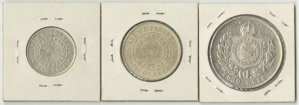 Brazil, Lot of 3 coins, Includes 500 Reis, 1889, KM-494, Choice VF; 1000 Reis, 1889, KM-495, XF-AU; and 2000 Reis, 1889, KM-485, cleaned XF. (3)