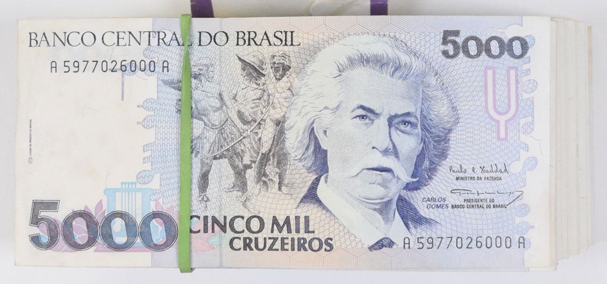 Brazil, ND (1993). 5000 Cruzeiros, P-232c, Issued Banknote pack of close to 500 Notes, Blue-black, Black and deep brown on light blue and m/c underprint, Portrait of C. Gomes at right with youths at center, Back is blue and m/c with statue of Gomes seated beside Piano in background, Notes are in UNC to Superb condition with original bank packing. CdM-B. Please do not value at a full 500 notes, though it might be complete and even more than 500, we did not take the time for an exact count. Sold "AS IS" no returns accepted.