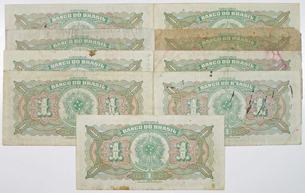 Brazil, Lot of 9 notes, Includes 1923, 1 Reis, P-110B, Issued, VG; and ND (1944), 1 Mil Reis (Cruzeiro), P-131A (8), between Vg to AU condition, Black on Green underprint on white paper, Portrait on front, Star on back. ABNC (9).