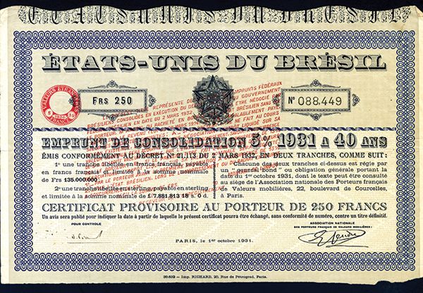 Brazil. Etats-Unis Du Bresil Emprunt de Consolidation, 1931. Issued in Paris, France, 250 Francs, 5%, starred Brazilian arms, blue frame, red 1934 revenue stamp, VF+, red printed endorsement.