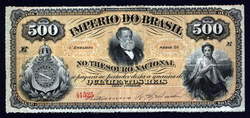 Brazil, ND (1874). 500 Reis, Estampa 1, Ser.54, E. P-A242, Issued banknote. Black on orange underprint with Dom Pedro II in center, allegorical woman on lower right and Arms on lower left, back orange. S/N 44525, Fine+ to VF condition with crisp paper, sharp corners, bright and vibrant colors. Scarce to find a high grade attractive issued example. The top, left and bottom margins were perforated for easy separation. ABNC.