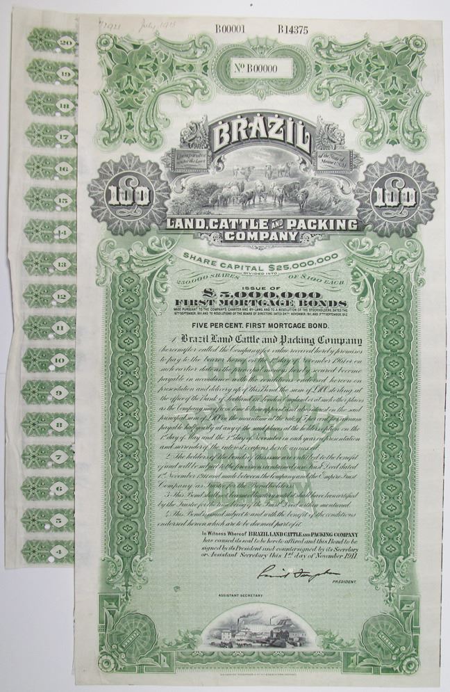 Brazil (Incorporated in Maine), 1911. 100 Pounds 5% First Mortgage Coupon Bond, Black text with ornate green border and background, Cattle drinking from pond at top center. 00000 serial number and POCs. VF condition, B & W. The Brazil Land, Cattle and Packing Company was expropriated by the Brazilian Government in 1940. Originally incorporated in the State of Maine. BW&C. Rare