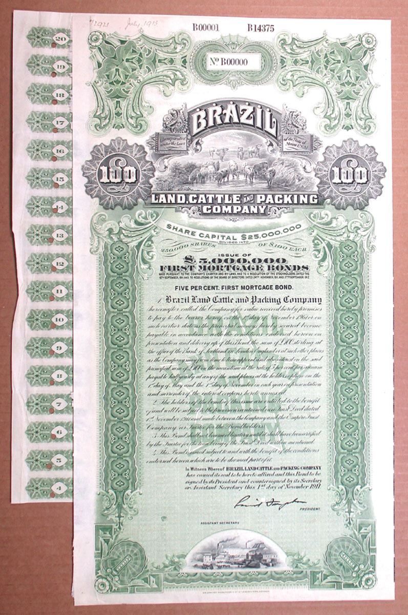 Brazil (Incorporated in Maine), 1911. 100 Pounds 5% First Mortgage Coupon Bond, Black text with ornate green border and background, Cattle drinking from pond at top center. 00000 serial number and POCs. XF condition, B & W. The Brazil Land, Cattle and Packing Company was expropriated by the Brazilian Government in 1940. Originally incorporated in the State of Maine. BW&C. Rare