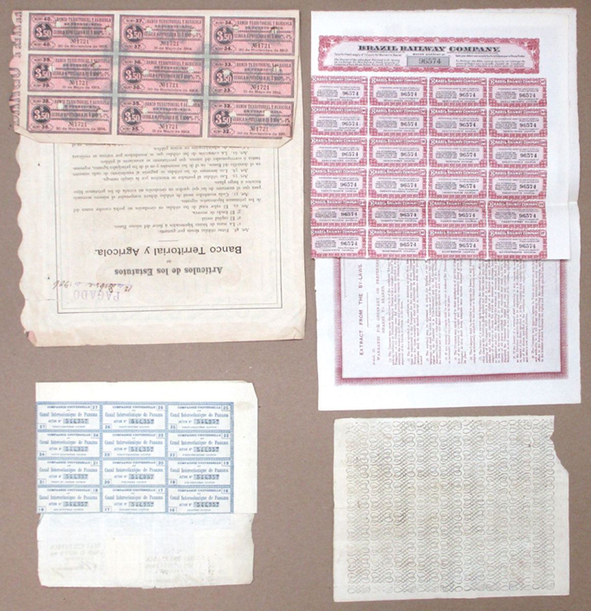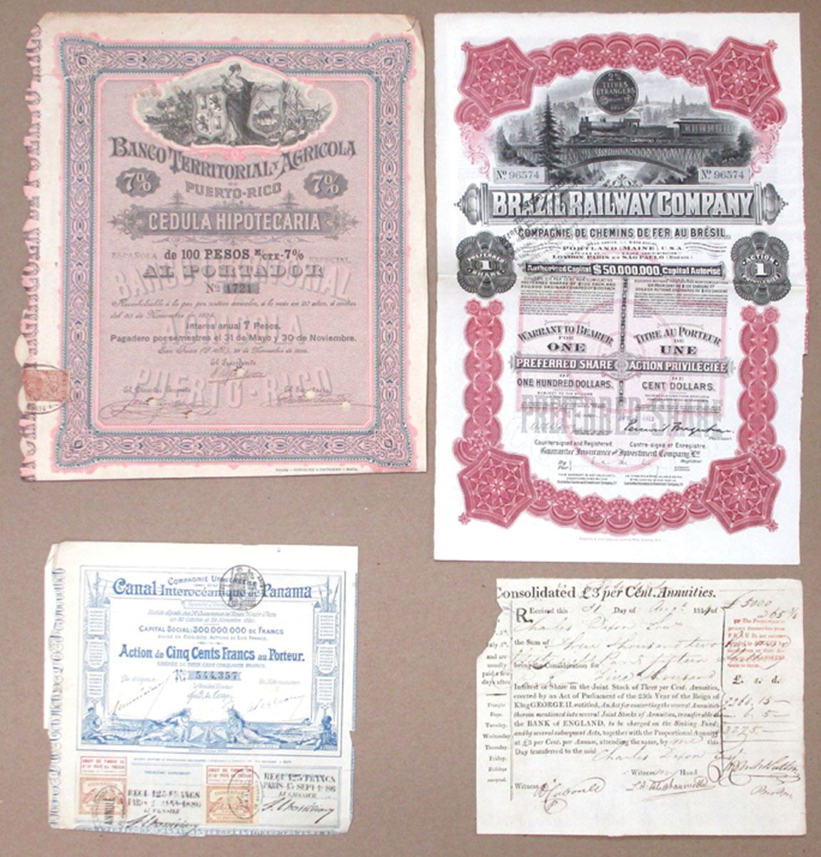 Brazil, Panama, England, Puerto Rico, 1814-1912. Lot of 4 Certificates from Europe and South America. Highlighted by an 1814, Bank of England, Consolidated Pound 3% Annuities; VF to VF+ condition. (4). Sold "AS IS" no returns accepted.