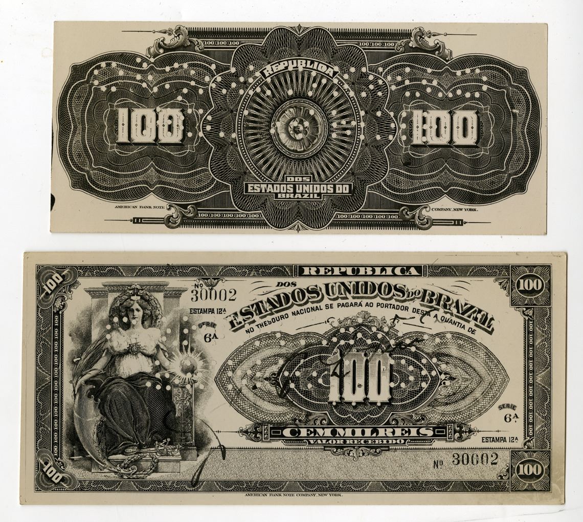 Brazil, E.12A (1912). 100 Mil Reis, P-66p, Obverse and Reverse Photo Proofs, Black and white photos printed on matte paper, Obverse shows woman seated with wreath at left, Reverse shows denomination at left and right with design at center, Photo shows that original was pin punched specimen, Front has S/N 30002, VF-XF condition. ABNC. These photo proofs of the original unused mockup designs were used during the production process to determine if the designs and text were correct or acceptable to the client and also used for approvals by ABNC. (2). Sold "AS IS" no returns accepted.