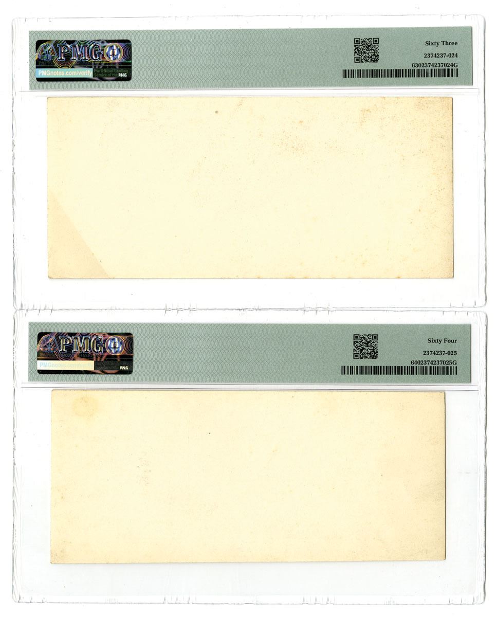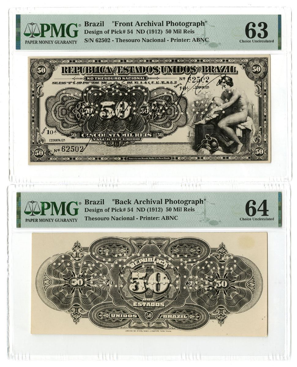 Brazil, ND (1912). 50 Mil Reis, P-54p, Obverse and Reverse Photo Proofs, Black and white photos printed on matte paper, Obverse shows a nude youth at right, Reverse shows denomination at center, Photo shows that original was pin punched specimen, Front has S/N 62502, ABNC. Both are PMG graded: Obverse is Choice Unc 63 and Reverse is Choice Unc 64. (2). Sold "AS IS" no returns accepted.