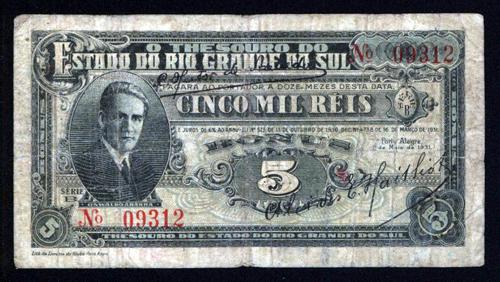 Porto Alegre, Brazil, 5 Mil Reis, Series B, P-S781, Issued banknote, Dark Gray on olive underprint, Portrait of Oswaldo Aranha on left, back with treasury building, S/N 09312, Note is intact with minimal edge faults, light paper toning and excellent paper quality for the Fine condition the note is in with a very small hole in the middle and one pin hole on the left middle. Scarce note in any condition and undervalued in SCWPM.