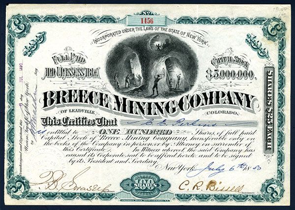 New York. 1880. 100 Shares I/U Stock. #1456. Black print with green border and underprint. Mining vignette top center. Fine condition. FBNC.