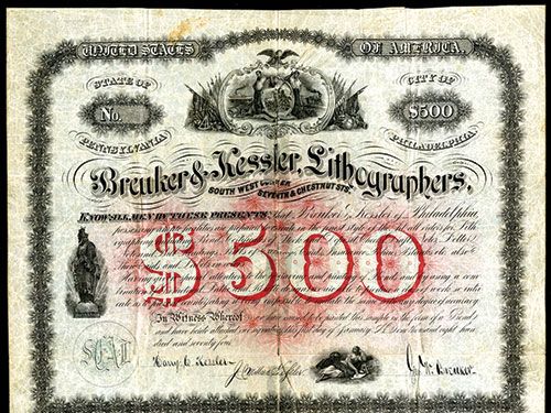 Philadelphia, 1874, $500, Black print with ornate black border and red underprint, State Seal top center with allegorical woman reclined on bottom and Minerva on left, Fine condition with toning vertical splitting and significant creasing from being crumpled. Early Philadelphia Lithographer.
