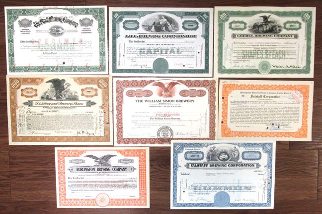 Delware......, Arizona, New York, Missouri, Michigan, 1933-169. Lot of 8 Stock Certificates, Includes: Burlington Brewing Co., U/U; Stroh Brewery Co., Specimen; William Simon Brewery, I/U; Distillery and Brewery Shares, I/C; and more. Pieces range from VF-XF condition. (8). Sold "AS IS" no returns accepted.