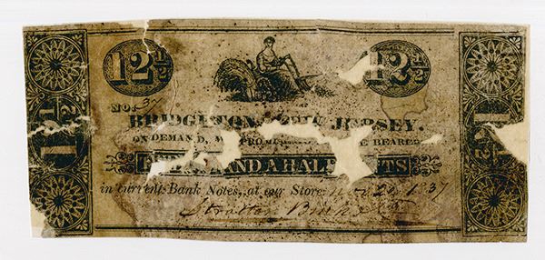 Bridgeton, NJ. 12 1/2 cents, Nov. 20, 1837, Wait 124, R-7. Good with major faults and missing pieces, but try to find a better one. Because of frequent change in ownership, the Bridgeton Glass Works usually operated under the name of its owners. Their scrip was issued from 1839 to 1879.