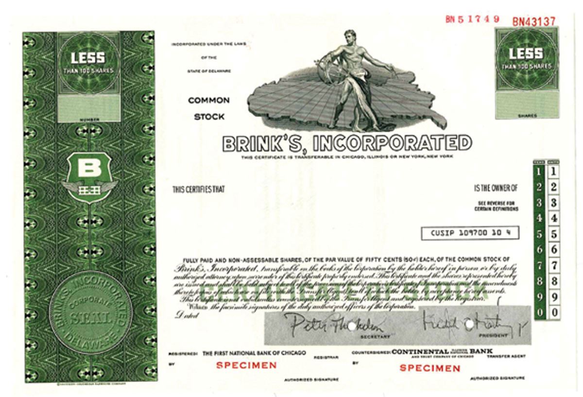 Famous Armored Car and Security company. Delaware. <100 Shares Common Stock Specimen Certificate, Black print on green border and under tint, Allegorical man at top, Specimen overprints and POC's, VF-XF condition, S-CBNC.