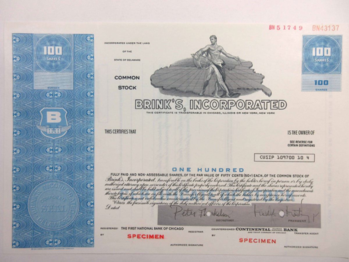 Brink's inc. 1960-70 100 Shares Specimen Stock Certificate XF Armored Transport. The Brink's Company is an American private security and protection company headquartered outside Richmond, Virginia. Its core business is Brink's Inc.; it spun off its Brink's Home Security operations into a separate company in 2008. The Brink's brand and reputation span around the globe.