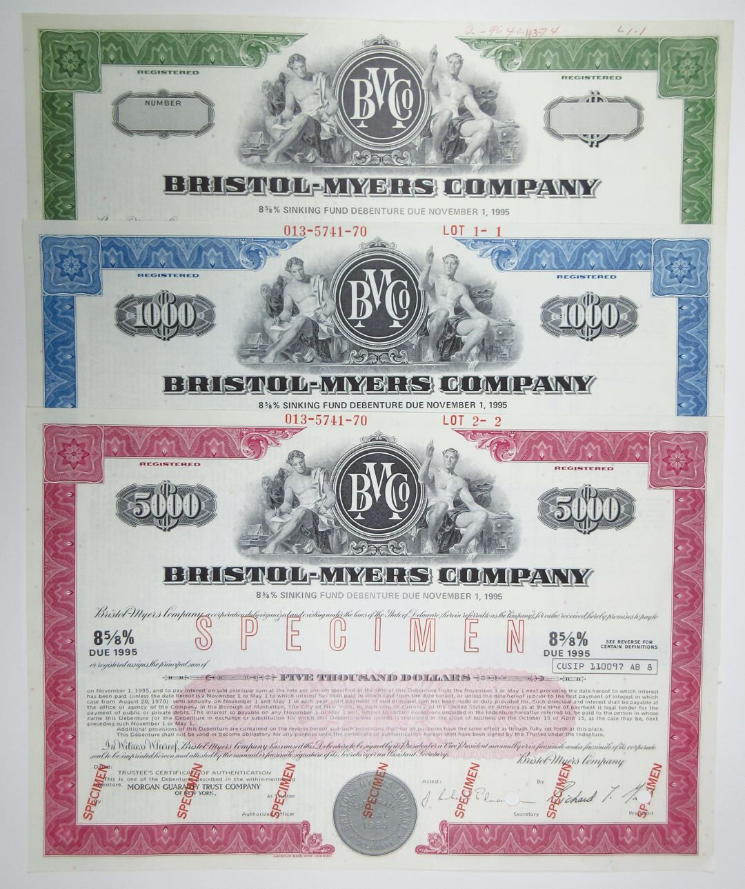 Bristol-Myers Co., 1969, Lot of 4 Specimen Registered 8 5/8% Sinking Fund Bonds, includes $-Odd, Green; $1000, Blue; and $5000 Maroon. In 1887, Hamilton College graduates William McLaren Bristol and John Ripley Myers purchased the Clinton Pharmaceutical company of Clinton, New York. In 1898, they decided to rename it Bristol, Myers and Company. Bristol-Myers and the Squibb corporation merged in 1989, with Bristol-Myers as the nominal survivor. The merged company became Bristol-Myers Squibb. (3)