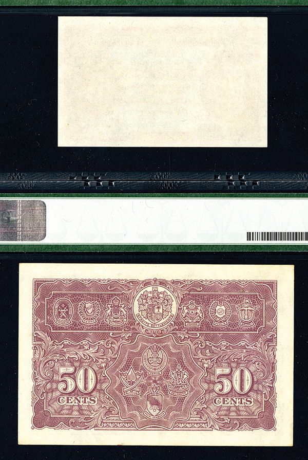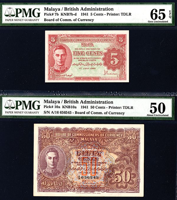 British Administration, Board of Commissioners of Currency Banknote Pair. Malaya. Lot of 2 issued notes. Include 1941, 5 cents, P-7b KNB7b-d, PMG graded Gem Uncirculated 65 EPQ and 50 cents, P-10a KNB10a, PMG graded About Uncirculated 50. Attractive pair of notes.