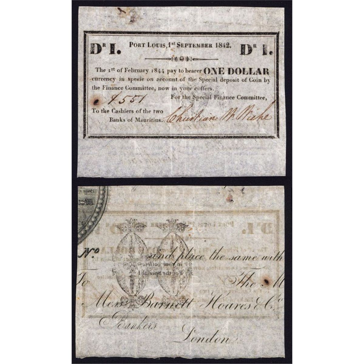Port Louis, 1st September 1842. $1, P-1F, Issued banknote, black on white paper, printed on back of cut up Mauritius Commercial Bank Issues, S/N 4551, the note appears XF to AU but there is a small ink burn hole on the middle left part of the note, Scarce and attractive Mauritius first issue.