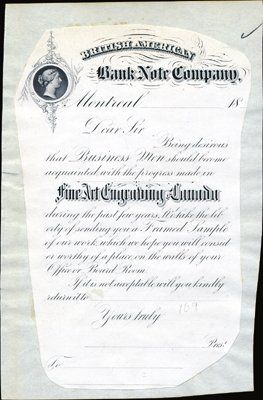 Montreal. Canada. 18--, (ca.1870-1880's). Proof of BABNC letter that accompanied framed proofs of samples of work done by BABNC. Letter states "Dear Sir, Being Desirous that Business Men should become acquainted with the progress made in Fine Art Engraving in Canada during the past four years, We take the liberty of sending you a Framed sample of our art work, which we hope you will consider worthy of a place on the walls of your Office or Board Room. If it is not acceptable will you kindly return to________________________". Printed on white coated stock type of paper and mounted on sample book page. Vignette of Queen used on philatelic stamp issues of Canada. Rare. Choice condition. BABNC.