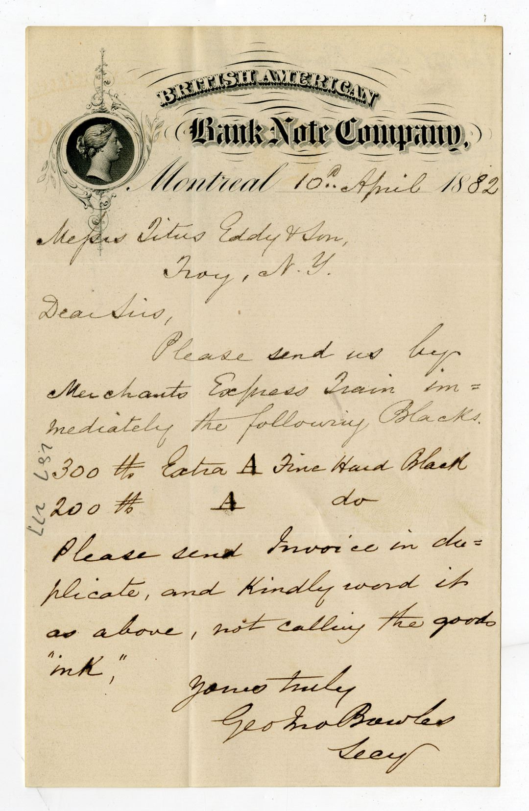 Montreal, Canada, April 10, 1882, Letter from George Bowles, of BABNC, to Titus Eddy & Son, requesting "Black 200 Extra Fine Hard...."(Printing Ink), by "Merchant Express Train", Letterhead has British American Bank Note Company on top with Queen Victoria portrait similar to the ones used on Canadian Stamps of that period and earlier. XF condition and lovely Security Printer collateral. BA-BNCo.