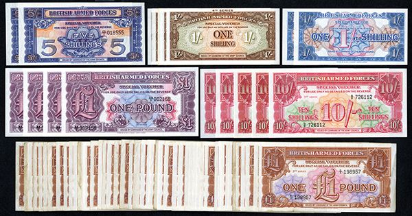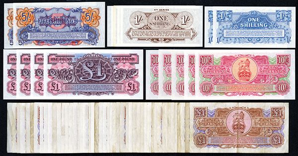 British Armed Forces, 1948-62, Group of 65+ Issued Notes Great Britain, lot of special vouchers, includes from the 2nd Series 5 Shillings, P-M20; 1 Pound, P-M22 (4 pcs); from the 3rd Series 1 Shilling, P-M26 (2 pcs); 10 Shillings, P-28 (5 pcs); 1 Pound, P-M29 (48 pcs); and from the 4th Series 1 Shilling, P-M32 (5 pcs). All AU-UNC apart from the P-M29 which range from VF to UNC. TDLR.