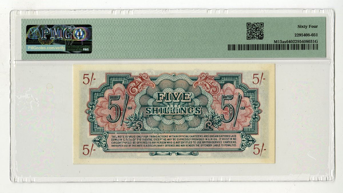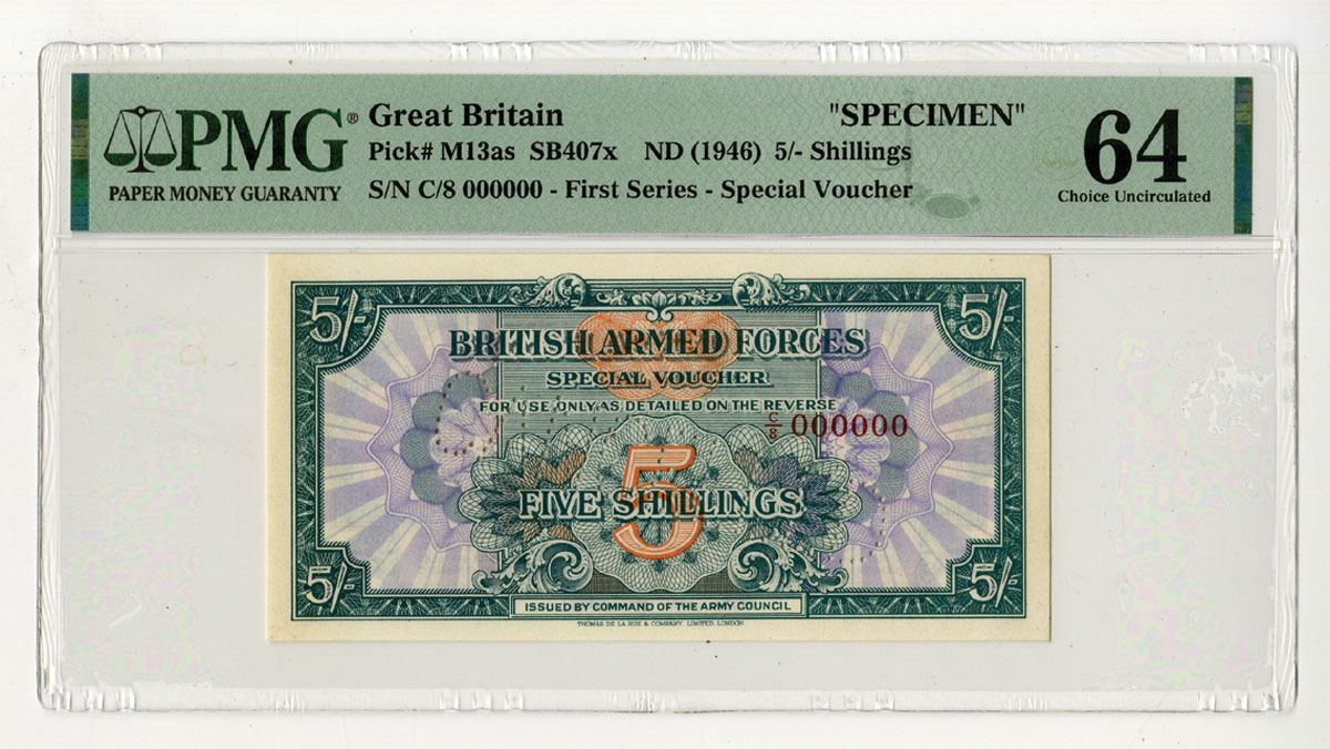 Great Britain, ND (1946). 5/- Shillings, P-M13as SB407x, First Series Specimen Banknote, Green on violet and orange underprint, Back is green and pale red, S/N C/8 000000, Pin punched Specimen, PMG graded Choice Uncirculated 64, TDLR. This note is tied as highest graded with one other out of only 3 graded in the PMG census. It is also the highest graded example to be offered at auction going back over 10 years.