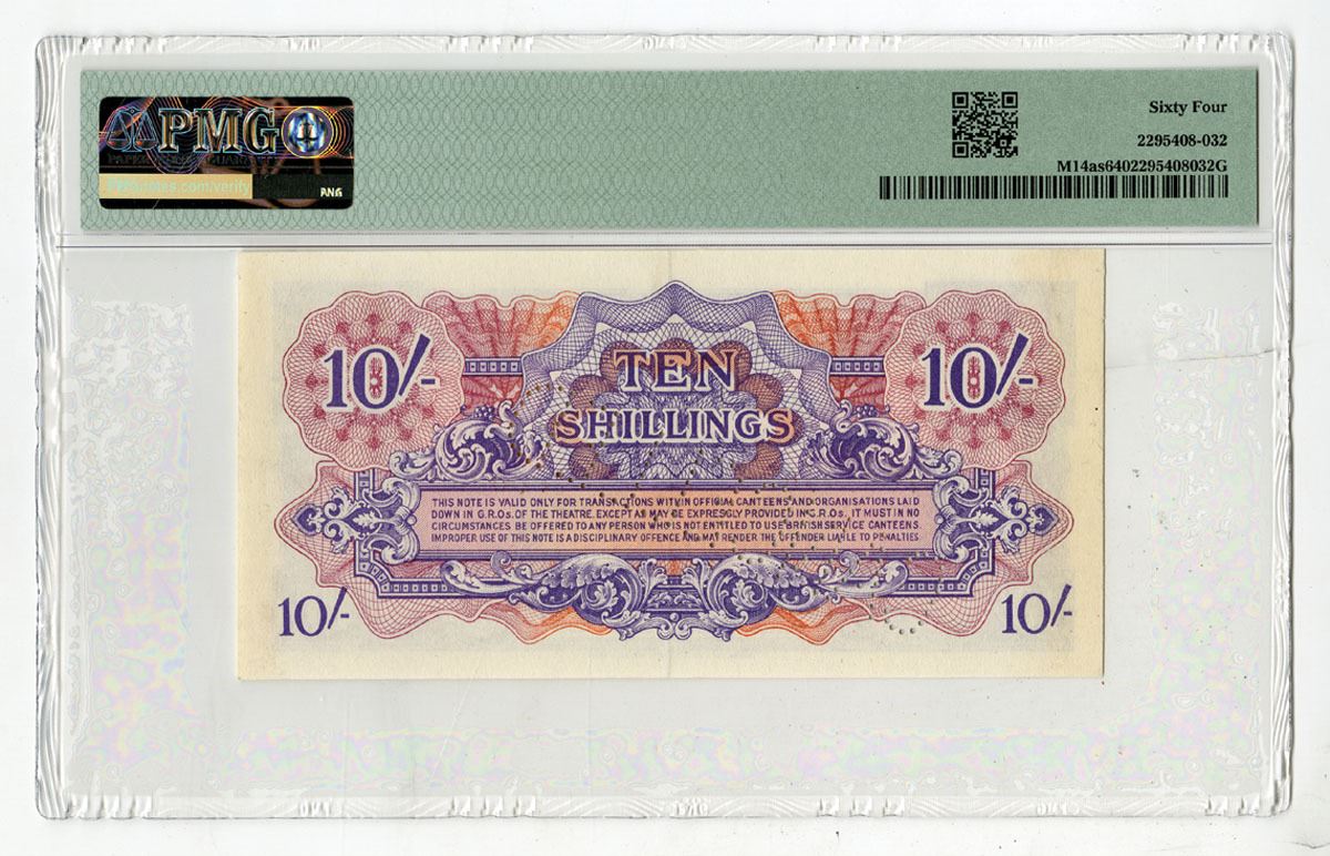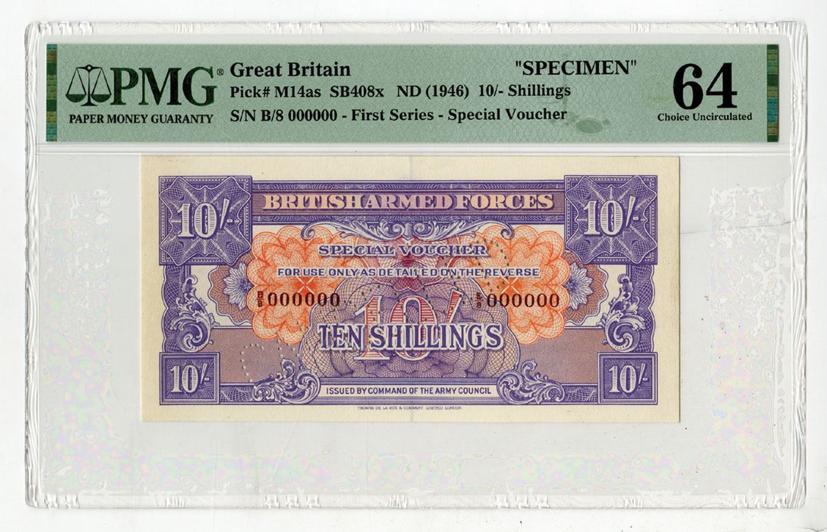 Great Britain, ND (1946). 10/- Shillings, P-M14as SB408x, First Series Specimen Banknote, Purple on orange and red-brown underprint, Back is purple with orange and red, S/N B/8 000000, Pin punched Specimen, PMG graded Choice Uncirculated 64, TDLR. This note is the highest graded out of only 3 graded in the PMG census. It is also the highest graded example to be offered at auction going back over 10 years.