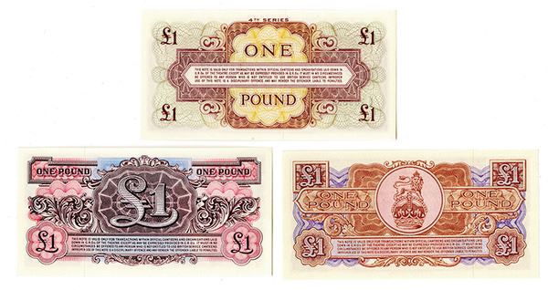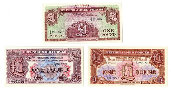 Great Britain, trio of different issued 1 Pound special vouchers for use by the Armed Forces, includes one from each of the 2nd, 3rd, and 4th Series. P-M22, P-M29, and P-M36, respectively. Choice Uncirculated. TDLR.