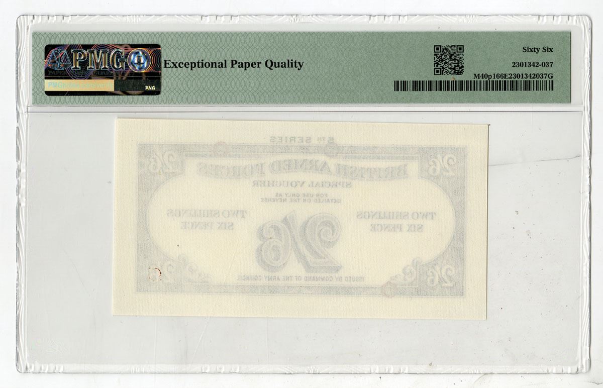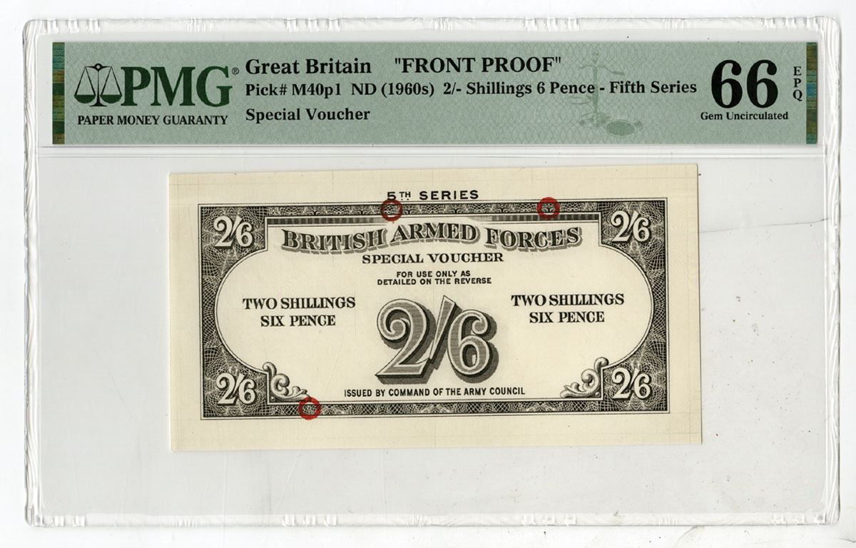 Great Britian, ND (1960s). 2/- Shillings 6 Pence, P-M40p1 Unlisted proof, Proof Special Voucher from the Fifth Series, Black printing on white paper with red circles over Secret Marks or errors, Uniface note, PMG graded Gem Uncirculated 66 EPQ. Rare note - only known as Specimen with very few proof examples existing. This is the only graded proof example in the PMG census. No examples have been offered previously at auction in the Track and Price census.