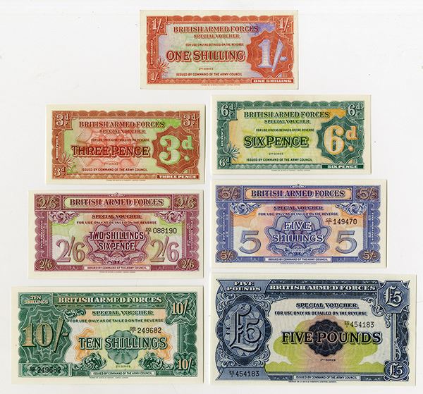 Great Britain. Lot of 7 notes from the series of 8 notes missing only the £1 note, all of the notes but the £5 note are in Choice to Gem Uncirculated or better condition. The £5 note is in Choice XF to AU. Includes 3d.; 6d.; 1/-; 2/-6d.; 5/-; 10/-; and £5, P-M16b to M23, all on Watermarked Paper. Attractive set.