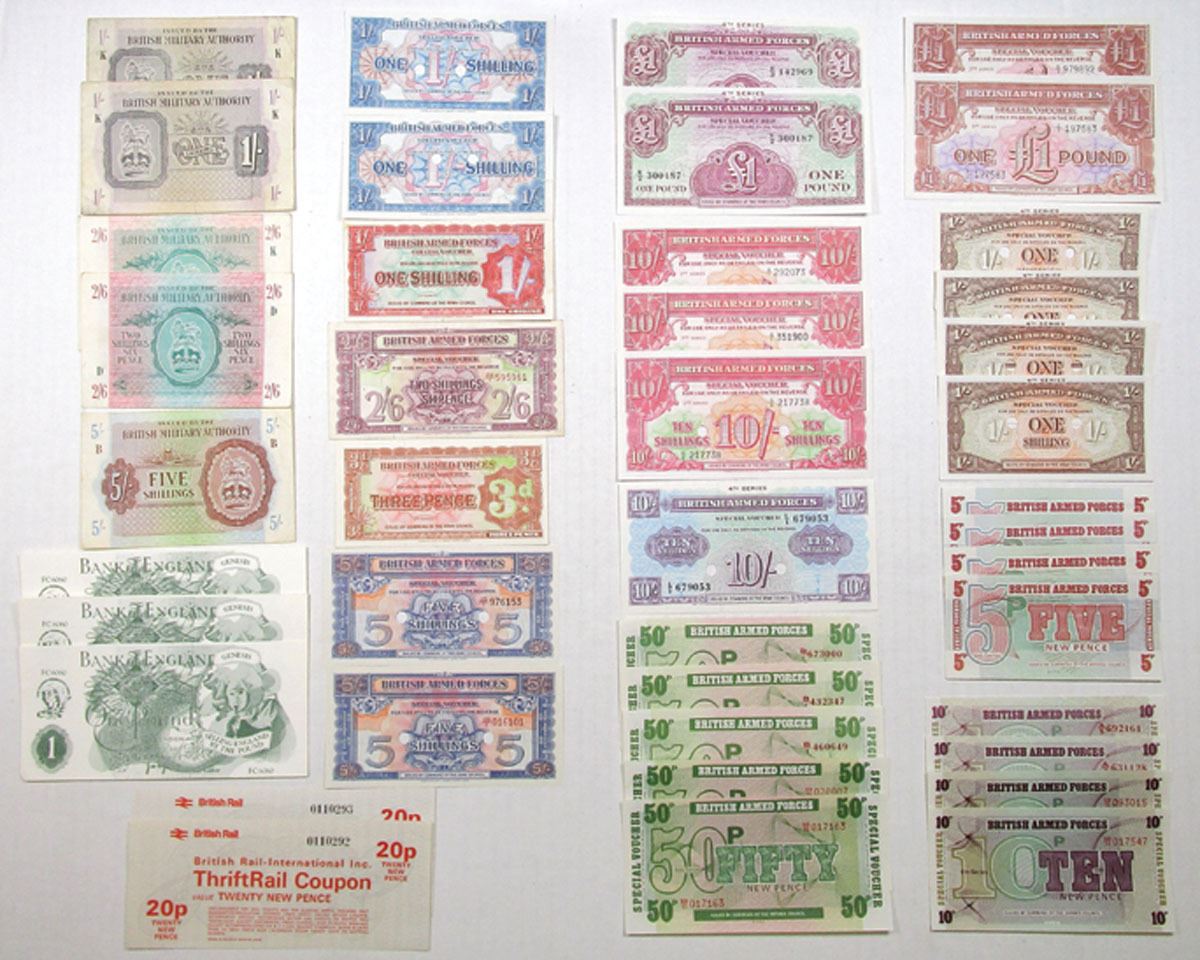 Great Britain, ND (1946-72). Lot of 40+ Issued Banknotes, Includes: 1 Shilling, P-M2 (2); 2 Shillings - 6 Pence, P-33 (2); 5 Shillings, P-M4; 3 Pence, P-M16a; 1 Shilling, P-M18a; 2 Shillings - 6 Pence, P-M19a; 5 Shillings, P-M20c (2); 1 Shilling, P-M26 (2); 5 Shillings, P-M27 (3); 10 Shillings, P-M28a (2); 1 Pound, P-M29 (2); 1 Shilling, P-M32b (4); 10 Shillings, P-M35b; 1 Pound, P-M36a (2); 5 New Pence, P-M44a (4); 10 New Pence, P-M45a (4); 50 New Pence, P-M46a (5). Lot also includes British Rail-International Inc. 20 New Pence Pair of Tickets and Bank of England Trio of Advertising Notes. Banknotes range from VF to AU condition. (41). Sold "AS IS" no returns accepted.