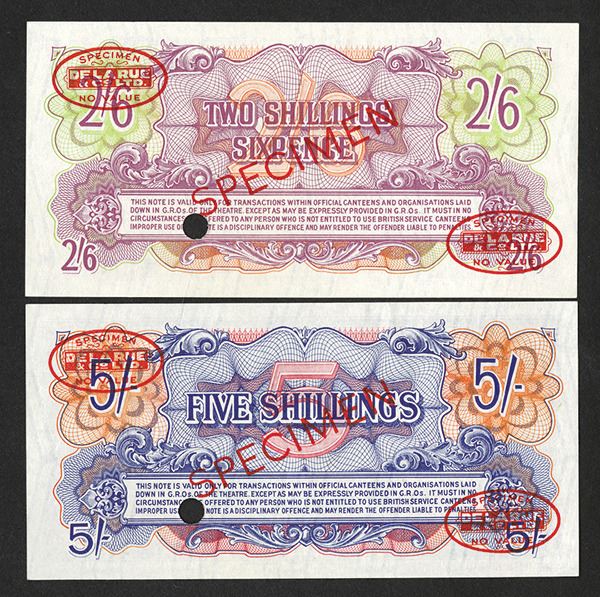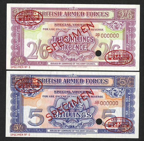 Great Britain, Lot of 2 notes. Both are ND (1961) specimens on watermarked paper. Includes 2/6 Shillings, P-M19b Unlisted Specimen and 5/- Shillings, P-M20c Unlisted Specimen, Both with red imprint on the lower left border "SPECIMEN No.6", Both have red specimen overprints on face and back as well as red oval specimen overprints on the upper left and lower right, bot with POC's. The notes appear Uncirculated but would grade AU due to a very light horizontal fold that has not broken the paper and is very subtle and is difficult to view. TDLR.