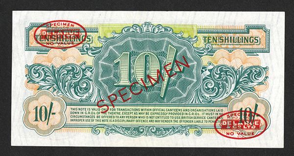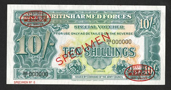 Great Britain, ND (1961) specimen on watermarked paper. 10/- Shillings, P-M21b Unlisted Specimen, Red imprint on the lower left border "SPECIMEN No.6", Red specimen overprints on face and back as well as red oval specimen overprints on the upper left and lower right, POC's. The notes appear Uncirculated but would grade AU due to a very light horizontal fold that has not broken the paper and is very subtle and is difficult to view. TDLR.