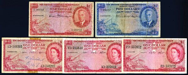 British Caribbean Territories, 1950-62, group of five 1 and 2 Dollar Issued notes, P-1, P-2, P-7. The P-1 (1950) is Fine condition, and so is the P-2 (1951) which has 3 pinholes. There are three different dates of the P-7, 1959 which is VF with tape traces and ink graffiti on obverse, 1960 which is VF, and 1962 which is also VF. BWC.
