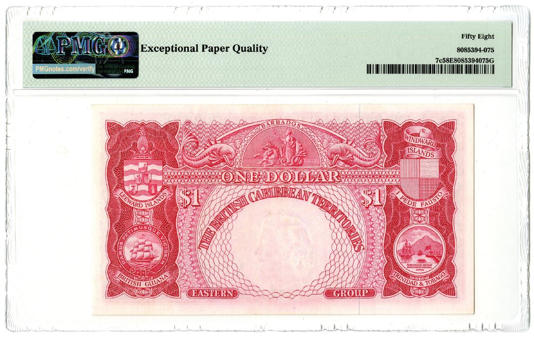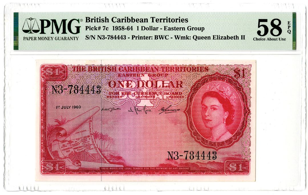 British Caribbean Territories. 1958-64. 1 Dollar - Eastern Group, P-7c, Issued banknote, Red, S/N N3-784443, Watermark: Queen Elizabeth II, PMG graded Choice About Uncirculated 58 EPQ. Printer: BWC.