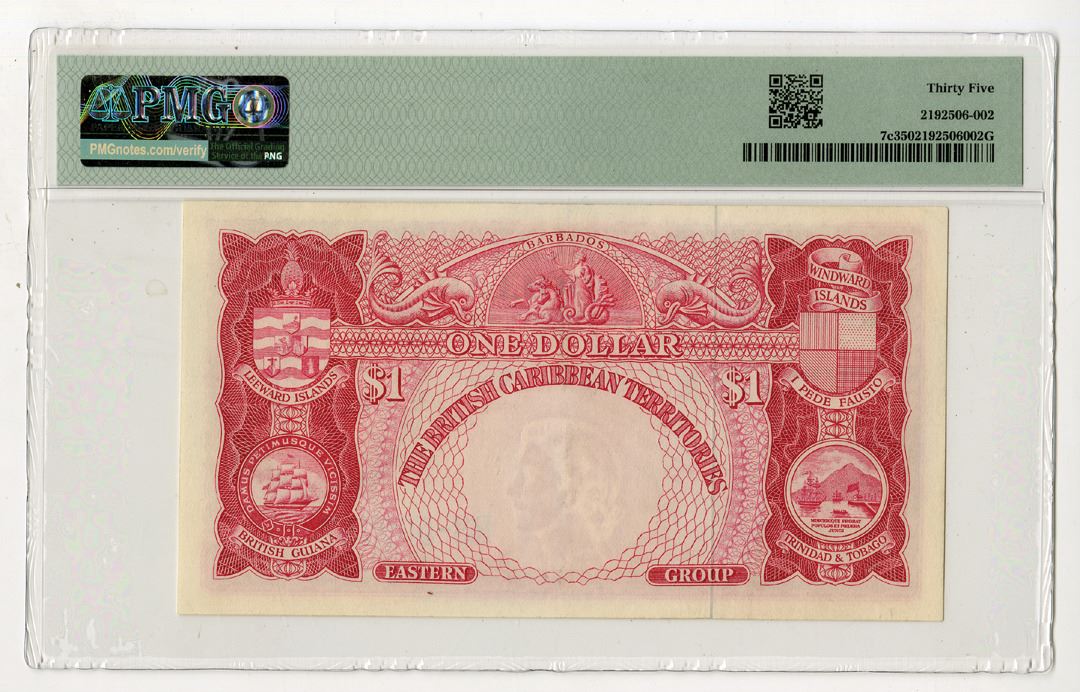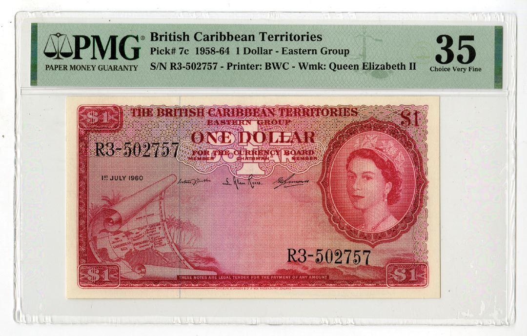 British Caribbean Territories, 1958-64. 1 Dollar, P-7c, Issued Banknote, Red on m/c underprint, Young portrait of Queen Elizabeth II at right and map of the Caribbean at left, S/N R3-502757, PMG graded Choice Very Fine 35, BWC.