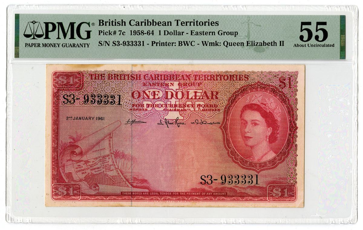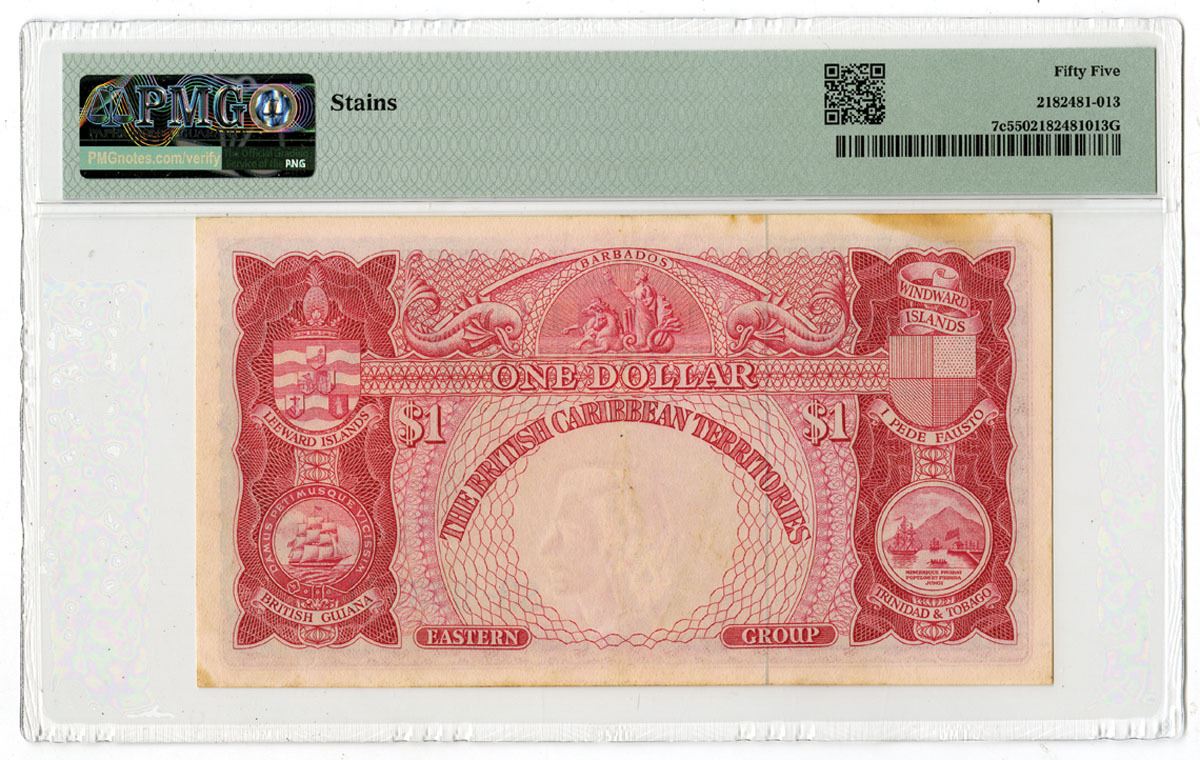 British Caribbean Territories, 1958-64. $1, P-7c, Issued Banknote, Red on pink/orange underprint with map at left and portrait of Queen Elizabeth II at right, S/N S3-933331, PMG graded About Uncirculated 55 with comment "stains," Printer: BWC.