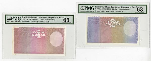 British Caribbean Territories. Eastern Group. Lot includes Progressive Proofs with partial obverse and full reverse. The first is 1 Dollar, ND (1953-1964), P-7pp, Queen Elizabeth II watermark, PMG Choice Uncirculated 63 with Printer's Annotations and Previously Mounted; the second is 2 Dollars, ND (1953-1964), P-8pp, Queen Elizabeth II watermark, PMG Choice Uncirculated 63 with Printer's Annotations and Previously Mounted. BWC.